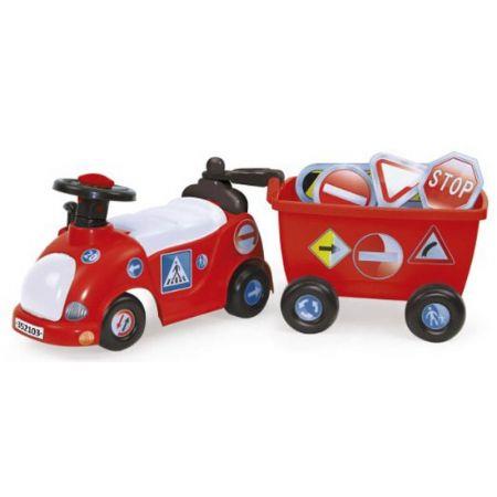 Czerwony jeździk w kształcie samochodu z przeczpką. Na przyczepce znajdują się znaki drogowe.