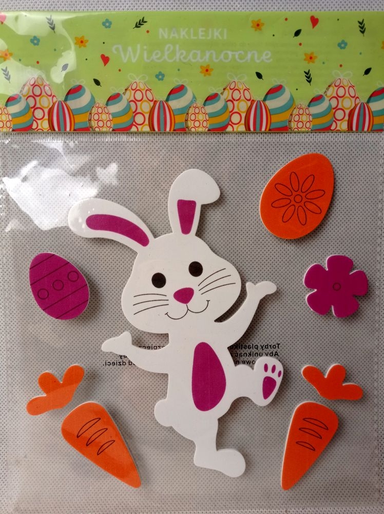 Ozdoby Wielkanocne. Produkt nie jest artykułem spożywczym! Służy do celów dekoracyjnych. Nie stosować na produktach drewnianych, papierowych, malowanych lub porowatych powierzchniach. Powierzchnie te mogą absorbować olej i kolor  produktu przez co może dojść do uszkodzeń mechanicznych powierzchni. Nie wystawiać na działanie wysokiej temperatury. Ostrożnie wyjmować z opakowania i ostrożnie naklejać. Produkt jest delikatny i może ulec uszkodzeniu. Sposób czyszczenia: przecierać wilgotną ściereczką. Usuń deikatnie opakowanie przed użyciem.
