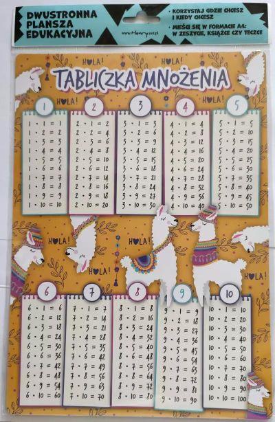 Plansza A4 Tabliczka mnożenia to dwustronna plansza/ściąga w formacie A4. Plansza wydrukowana na grubym papierze kredowym, która dodatkowo pokryta jest folią błyszczącą. Rogi planszy są zaokrąglone.